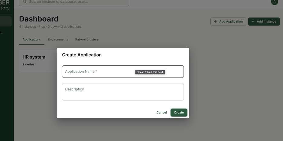 When you log in, you immediately define applications. Just the application name is enough to associate databases and instances correctly. This creates a clear mapping between PostgreSQL instances, environments, and the applications that depend on them.